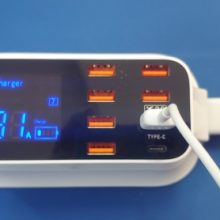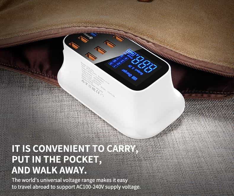 Visuelle LCD-Anzeige – Ausgestattet mit einer digitalen LCD-Anzeige, zeigt auf intelligente Weise den aktuellen und den Ladestatus für jeden Ladeanschluss auf dem Bildschirm an. Geringes Gewicht und kompaktes Design sind ideal für den Einsatz zu Hause, im Büro und am Schreibtisch. Großer Eingangsspannungsbereich von AC100-240V, der sich perfekt für internationale Reisen eignet.